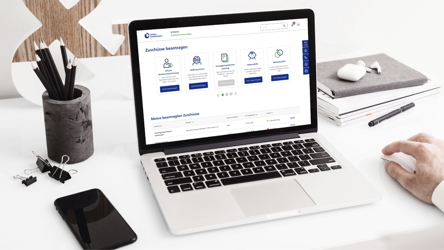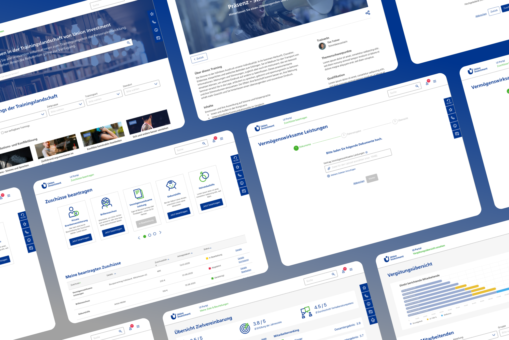 Gemeinsam mit Union Investment arbeiten wir an der bestmöglichen digitalen Employee Experience für die gesamte Belegschaft. In diesem Zusammenhang wurde in enger Zusammenarbeit mit VANTAiO das HR-Portal neu konzipiert, bestehend u. a. aus den Bereichen: Mitarbeiterzuschüsse, Vergütungsübersicht, vermögenswirksame Leistungen und der Trainingslandschaft. Die Herausforderung lag vor allem darin, die sonst eher funktional ausgerichtete SAP-Nutzeroberfläche gestalterisch ansprechend und bedürfnisorientiert aufzusetzen.