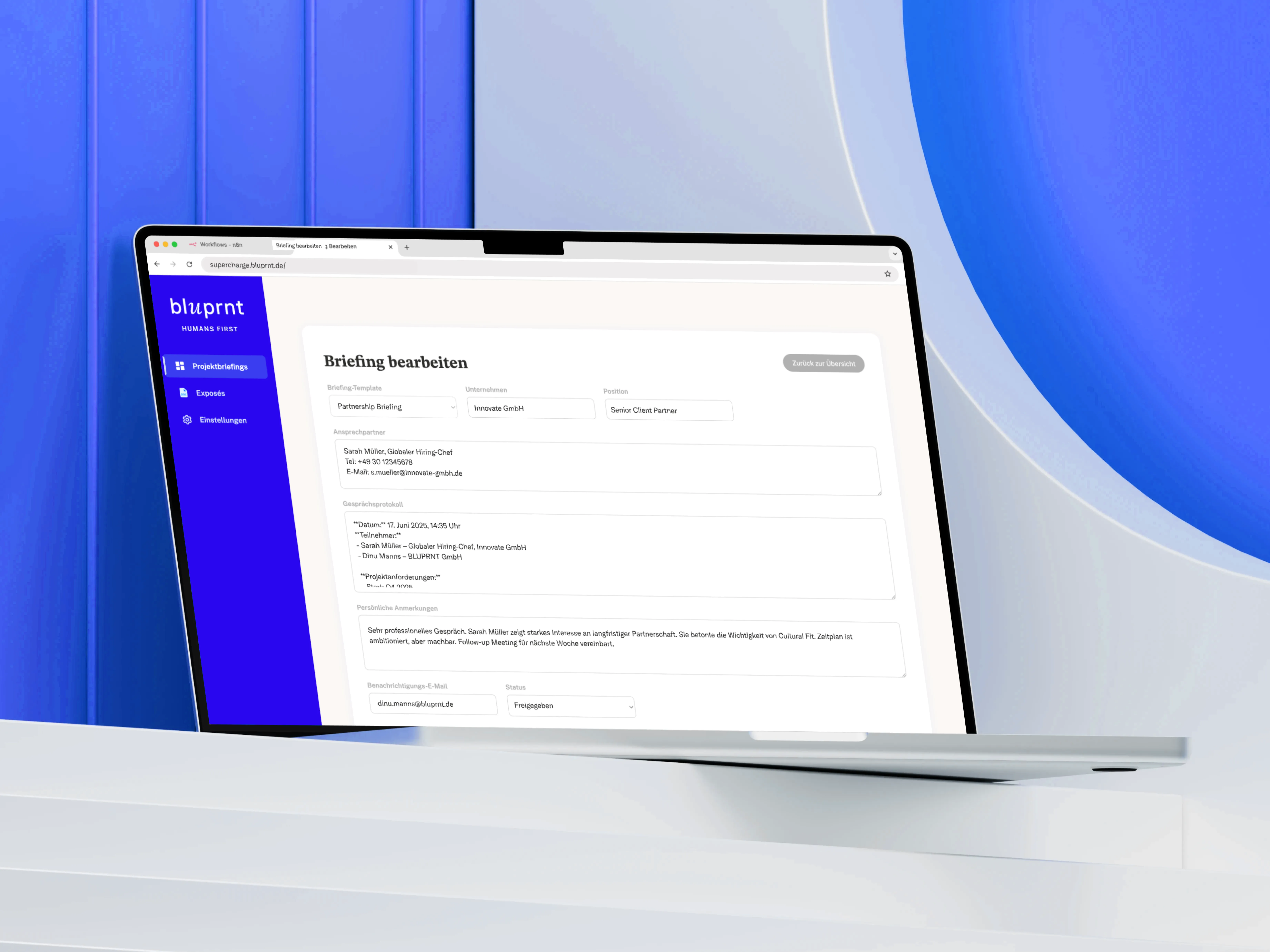 Aus Gesprächsnotizen wird automatisch ein fertiges Dokument. Du gibst die wichtigsten Informationen aus Deinem (Kunden)Gespräch ein, unsere KI-Lösung erstellt daraus strukturierte Angebote, Projektbriefings oder Berichte. Komplett mit Eurem Corporate Design und Euren Standards. Das spart Stunden pro Woche und eliminiert den Frust beim Nachbereiten von Meetings.